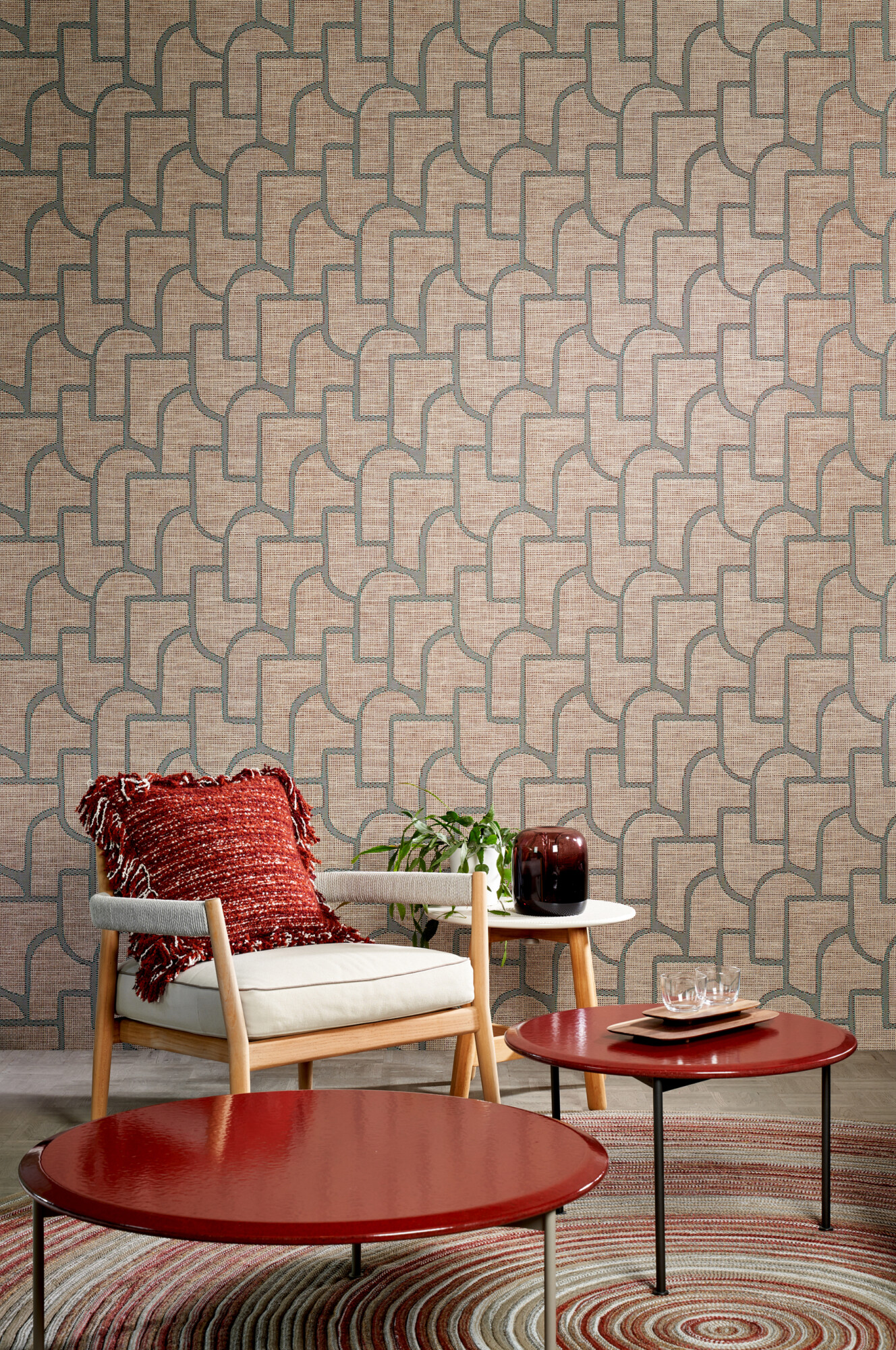 Esparto is a strong fibre made from two species of perennial grasses of North Africa, Spain and Portugal. In woven form it is used for all kinds of crafts, to create both decorative and utilitarian objects. In this instance, it inspired a design in which the rounded shapes contrast beautifully with the randomly arranged pattern.