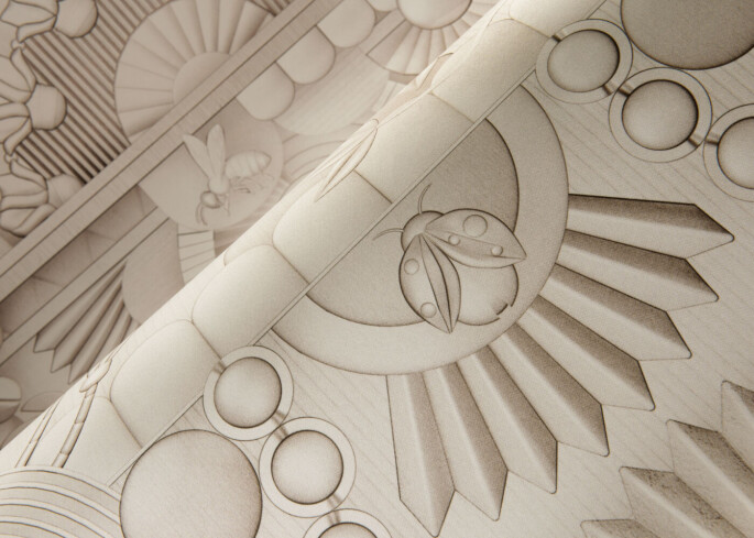 The Greenhouse Gathering wallcovering is a stunning wallcovering that draws inspiration from decorative moulding. The design imitates the sensation of peering through the glass panels of a Green House, uncovering the mesmerising marvels of lush flowers. When examined more closely, intricate features become apparent, highlighting the hidden small creatures moving through a lush green landscape. Infused with the charm of art deco, the Greenhouse Gathering wallcovering comes in a monochrome palette that reminds of plasterwork. The wallcovering has a soft suede look for added tactility.