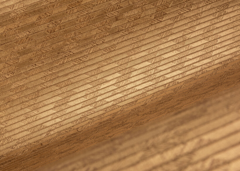 A traditionally-made wallcovering with hand-folded paper as an eyecatcher. The paper is patinated with metallic ink and cut into small strips. These strips are woven with a hand loom. So there is no repeated pattern, making every piece genuinely unique.
