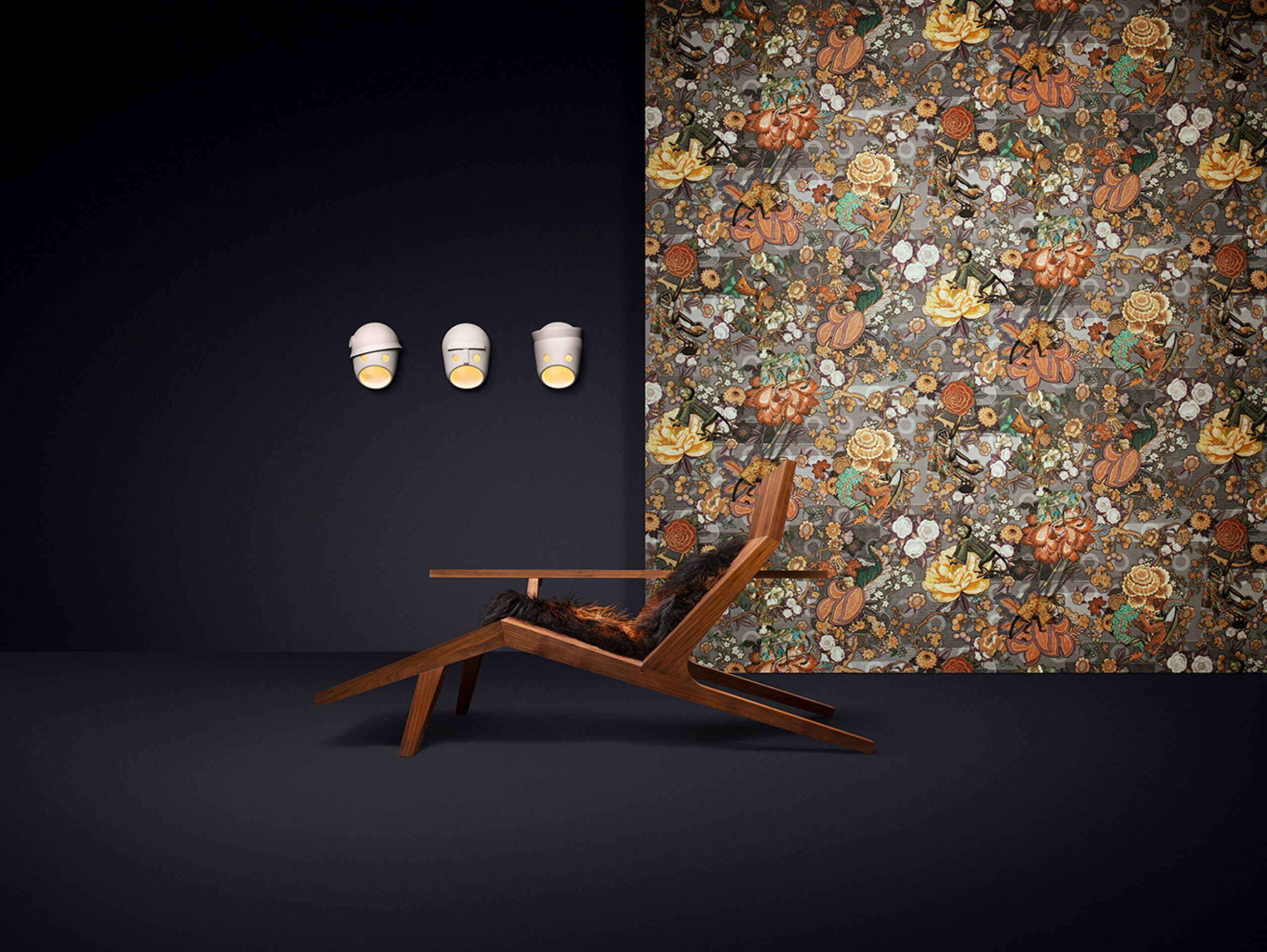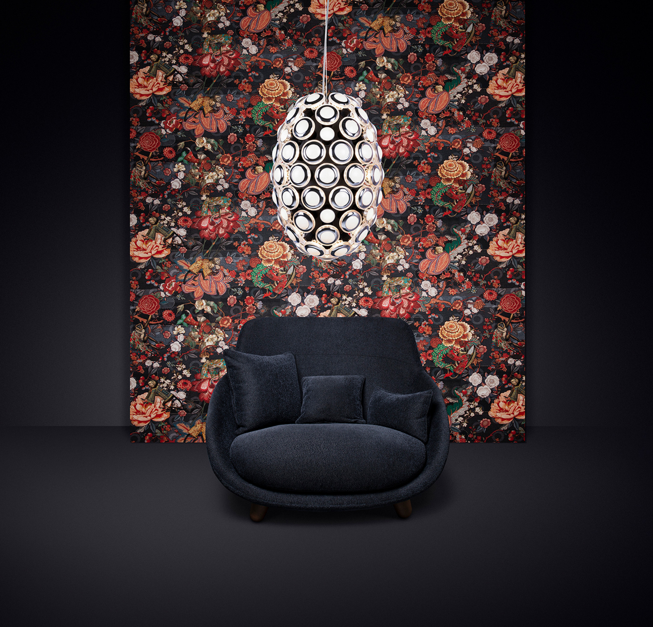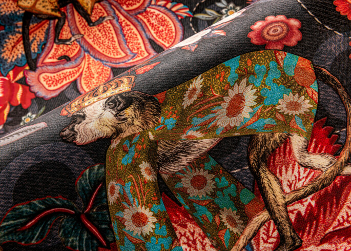 Printed on a soft and velvety finish fabric with denim textures, this lively wallcovering depicts a lush forest brimming with life and movement. Upon closer inspection, Indigo Macaques dressed in traditional kimonos can be discovered between the abundance of exotic flowers.